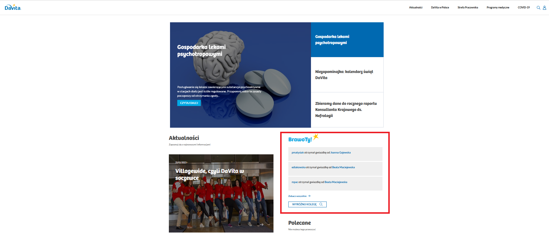 Zlokalizowana jest na stronie głównej intranetu (http://davitaintranet.052b.work/), w jej prawej części, tuż pod najnowszymi newsami (Krok 1). By kogoś wyróżnić, wystarczy wpisać jego nazwisko w wyszukiwarkę i je kliknąć (Krok 2), a potem wybrać kategorię, w której chcesz przyznać gwiazdkę oraz dodać krótkie uzasadnienie (Krok 3). I gotowe! Całość zajmuje minutę, a komuś może uprzyjemnić cały dzień – wiemy to bez pomocy amerykańskich naukowców😉 Co miesiąc masz do przyznania 7 gwiazdek, tyle ile mamy wartości, działaj z nimi wedle własnego uznania.