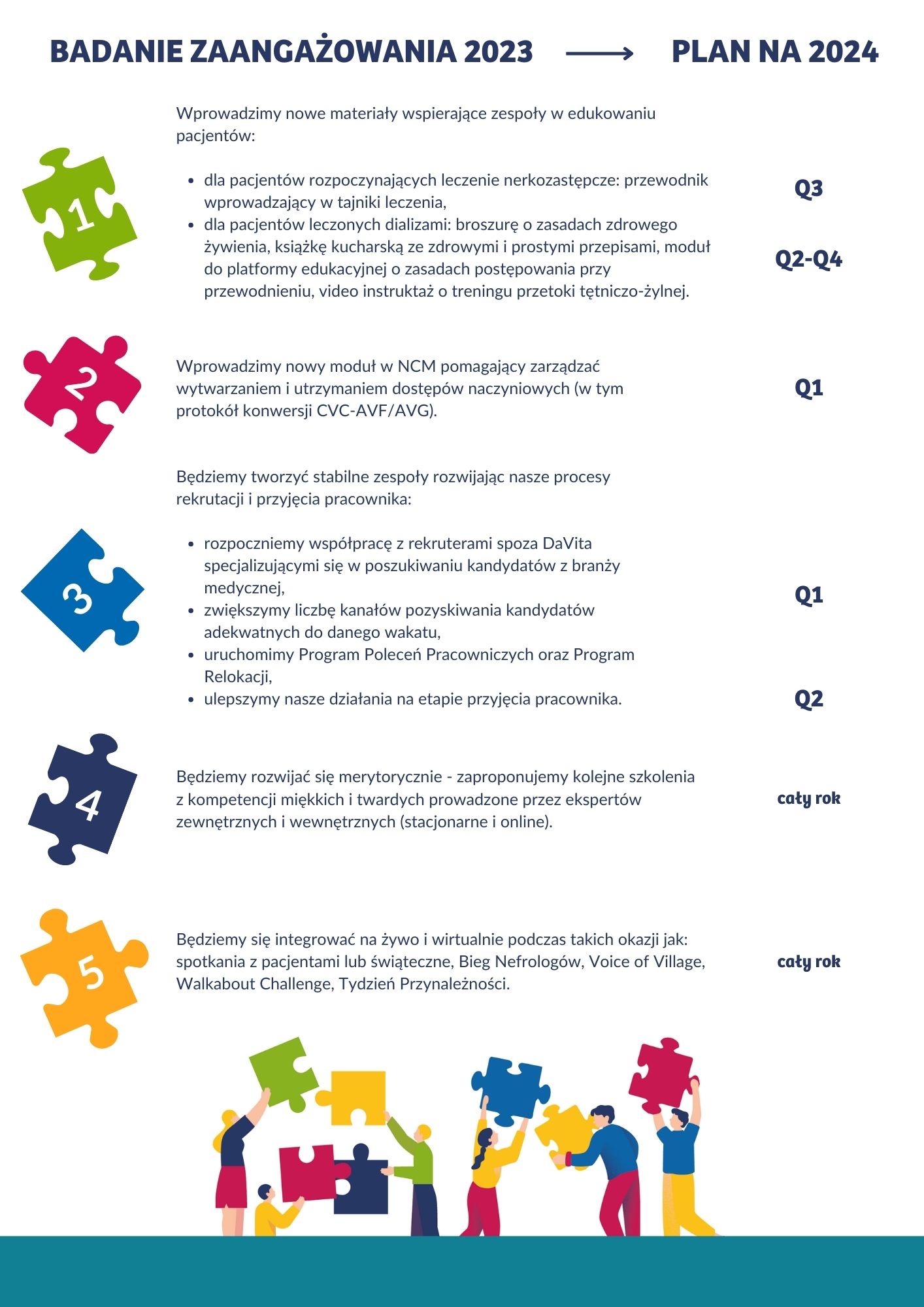 Jeśli chodzi o przygotowanie materiałów wspierających edukację pacjentów, to działamy zgodnie z planem. Obecnie kończymy prace nad broszurą o zasadach zdrowego żywienia (niebawem w intranecie i stacjach) i jednocześnie przygotowujemy książkę kucharską dla pacjentów (tę przekażemy im jako prezent świąteczny). Jesteśmy już także na zaawansowanym etapie prac związanych z przewodnikiem dla pacjentów rozpoczynających leczenie dializami – udostępnimy go w wakacje. Następnie zaś moduł o przewodnieniu (będzie gotowy na początku 4. kwartału), a po nim – video instruktaż dotyczący ćwiczenia przetoki (grudzień).