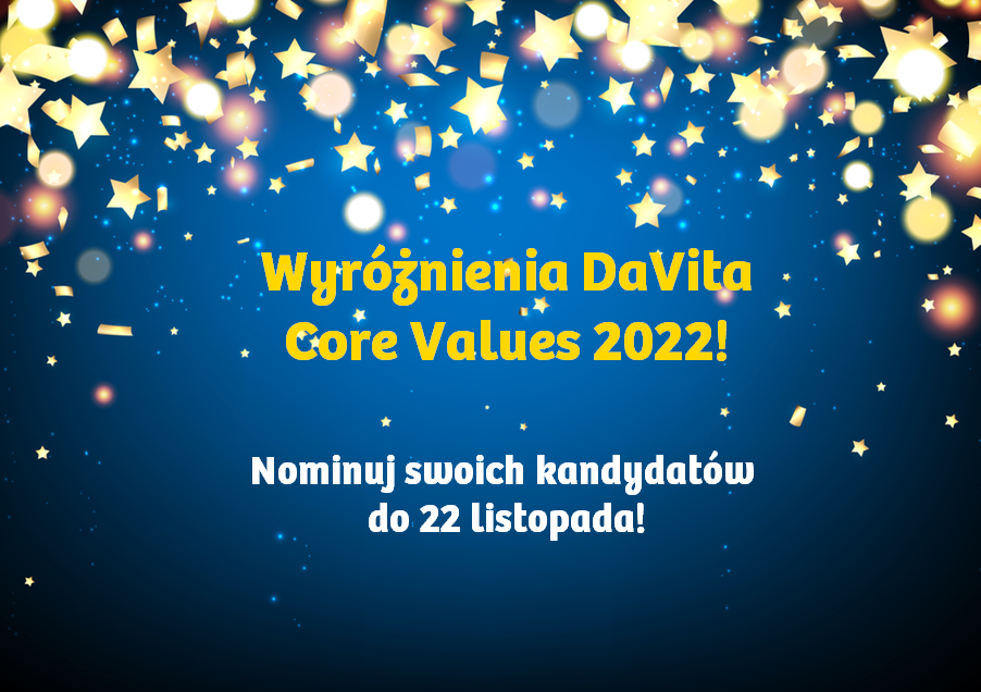 Jak co roku o tej porze zapraszamy do wskazywania swoich kandydatów do wyróżnień DaVita związanych z naszymi podstawowymi wartościami. Znasz osoby, które na co dzień są ucieleśnieniem wartości DaVita? Koniecznie zgłoś ich kandydatury. Zostało już tylko kilka dni!