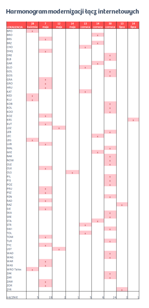 [AKTUALIZACJA 24.04: Ostatnia awaria teleinformatyczna niestety wpłynęła na możliwość prac związanych ze zmianą łącz. Stacje, które miały mieć modernizowane łącza w połowie kwietnia i na początku maja, będę mieć je zmodernizowane na koniec maja. Pozostały harmonogram jest aktualny. Czekamy już teraz tylko do dokończenie rekonfiguracji sieci przez Zespół USA i będziemy dalej działać prężenie. Przepraszamy za zmianę, zrobimy wszystko, by nowe łącza jak najszybciej oddać do Waszej dyspozycji i byście byli z tej zmiany zadowoleni].
